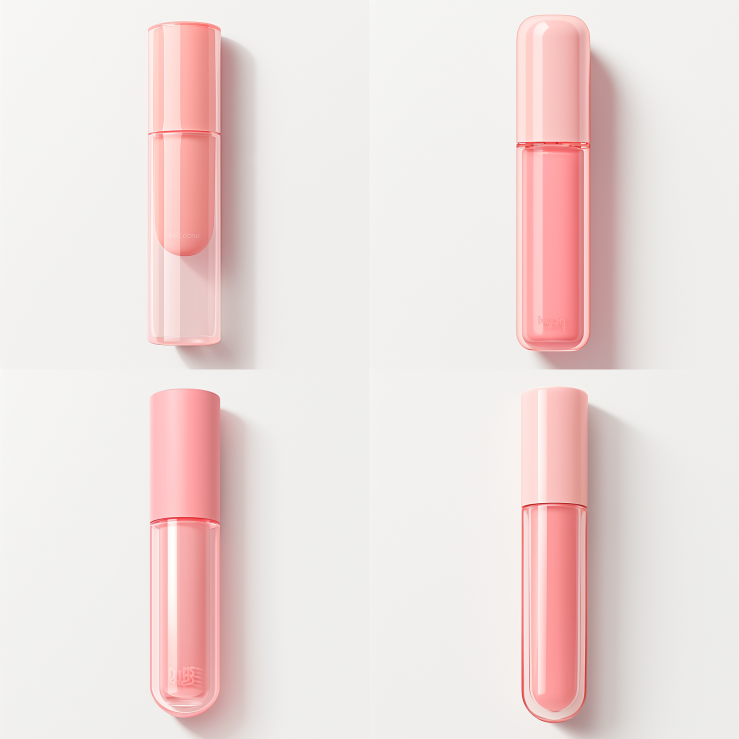 product photo of a cosmetic lip tint bottle, cute rounded pebble-shaped bottom, glossy opaque plastic material, pastel pink solid color, tall cylindrical cap with smooth rounded edges, minimalistic vertical text logo on the body, professional studio lighting, isolated on clean white background, ultra high resolution, realistic product photography